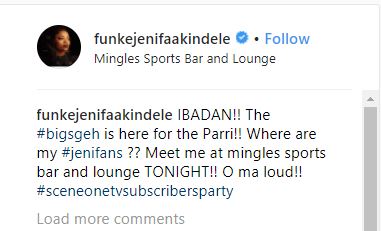 “IBADAN!! The #bigsgeh is here for the Parri!! Where are my #jenifans ?? Meet me at mingles sports bar and lounge TONIGHT!! O ma loud!! #sceneonetvsubscribersparty”